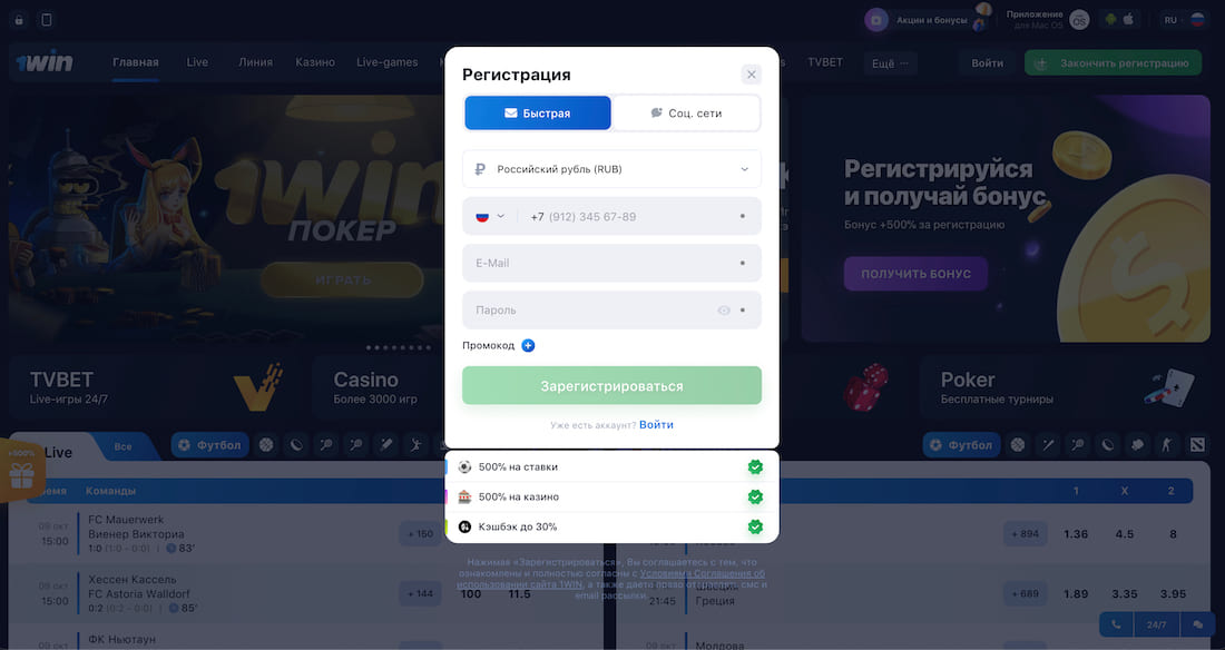 Игрокам достаточно зайти на сайт 1Вин, найти кнопку «Регистрация» и нажать на нее. Далее остается выбрать способ создания профиля и заполнить анкету. Для более быстрой регистрации в 1 Win можно использовать аккаунты в VK, OK, Google, Yandex, mail.ru, Телеграм или Steam.